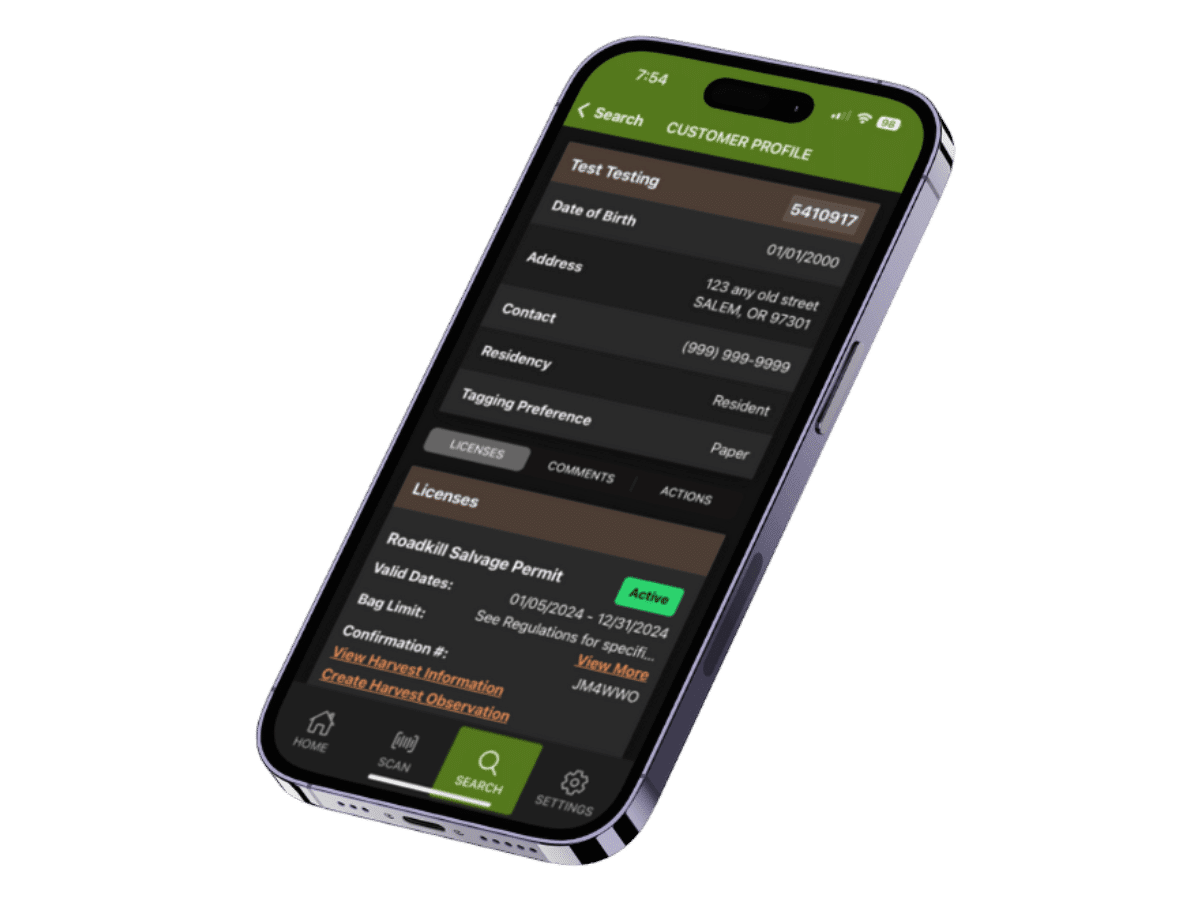 Access to this customer data provides critical information for Officers to validate the customer’s offline mobile app information and reduce the opportunity for hunters to evade the law. Officers can quickly check customer data directly in their enforcement app be searching for the customer via name or ID, or scanning the QR codes displayed on the customer’s mobile app screen. The dual authentication of the public customer’s phone and the law enforcement app ensures the integrity of the conservation regulations are maintained.