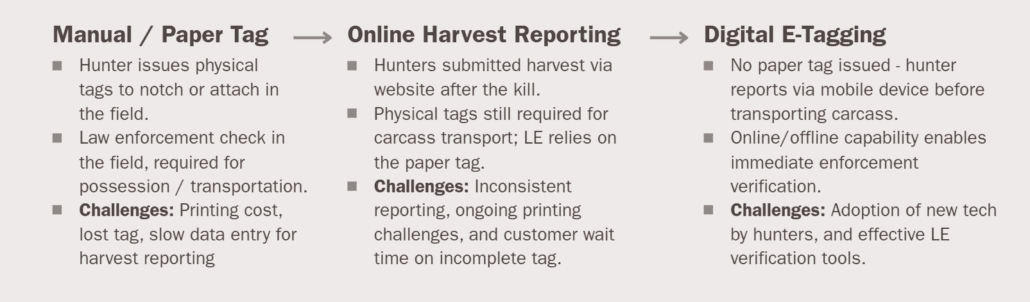 Wildlife agencies are modernizing their harvest documentation programs to strengthen real-time data collection and simplify compliance by going digital with electronic harvest reporting and etagging.